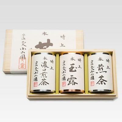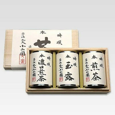 ・玉露50g ・煎茶80g ・濃口煎茶80g 栽培から製造まで「品質本位の茶づくり」を一貫して行い親しまれている京都、宇治の丸久小山園。 開化堂製の手作り茶筒、桐箱入りで大切な方へのご進物にふさわしい逸品です。