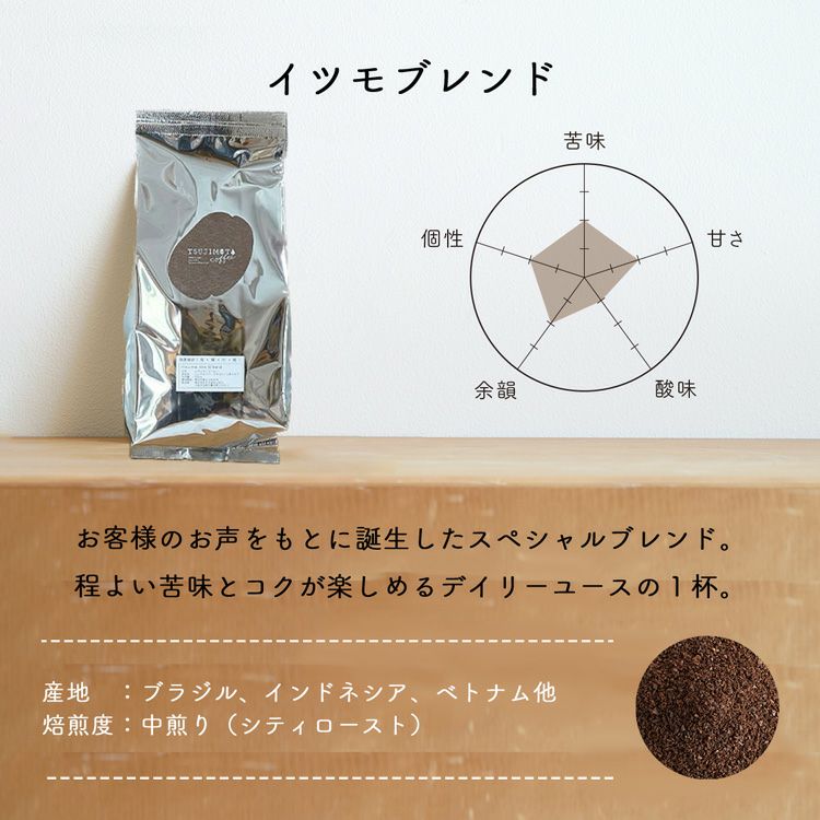 他の画像を見る いつも身近な一杯に 大容量パック・業務用におすすめレギュラーコーヒー豆イツモブレンド 500g 中煎り お急ぎ便 3.75 (8) 当店特別価格 ¥ 1,296 税込 詳細を見る お気に入りに登録する